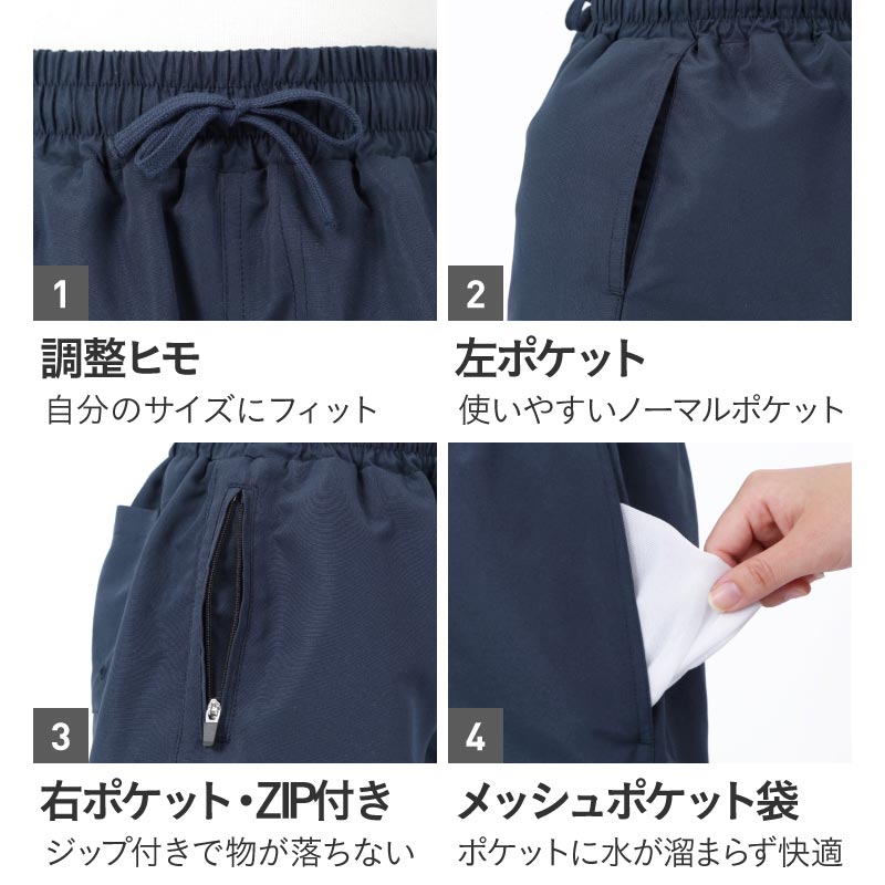 素材感にもこだわった水陸両用パンツ [水陸両用]水辺でも使える [吸水速乾]汗を素早く吸収して発散 [耐塩素]プールでの使用による生地の劣化を防ぐ [ZIP ポケット]中身が飛び出さず安心 [インナー]水や砂が溜まりにくいメッシュタイプ |