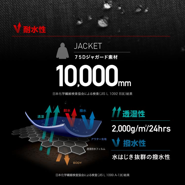 ・驚異の耐水・撥水力!高い耐水性能で雨雪などの水の侵入を防ぐ