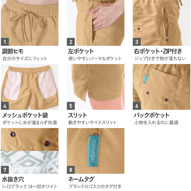 ICEPARDAICEPARDAL IR-7600 여성 서프 팬츠 수륙 양용으로 고기능! 복숭아까지 커버 할 수있는 롱 길이입니다. 【서프 팬츠】 ・수륙 양용 사양 ・풀에서도 입은 채로 수영하는 내염소 가공 ・흡한 속건으로 해양 스포츠에 활약 ・상냥한 촉감 ・물이 빠져 무거워지지 않는 물 구멍 탑재 ・웨스트는 끈으로 조절 가능 |