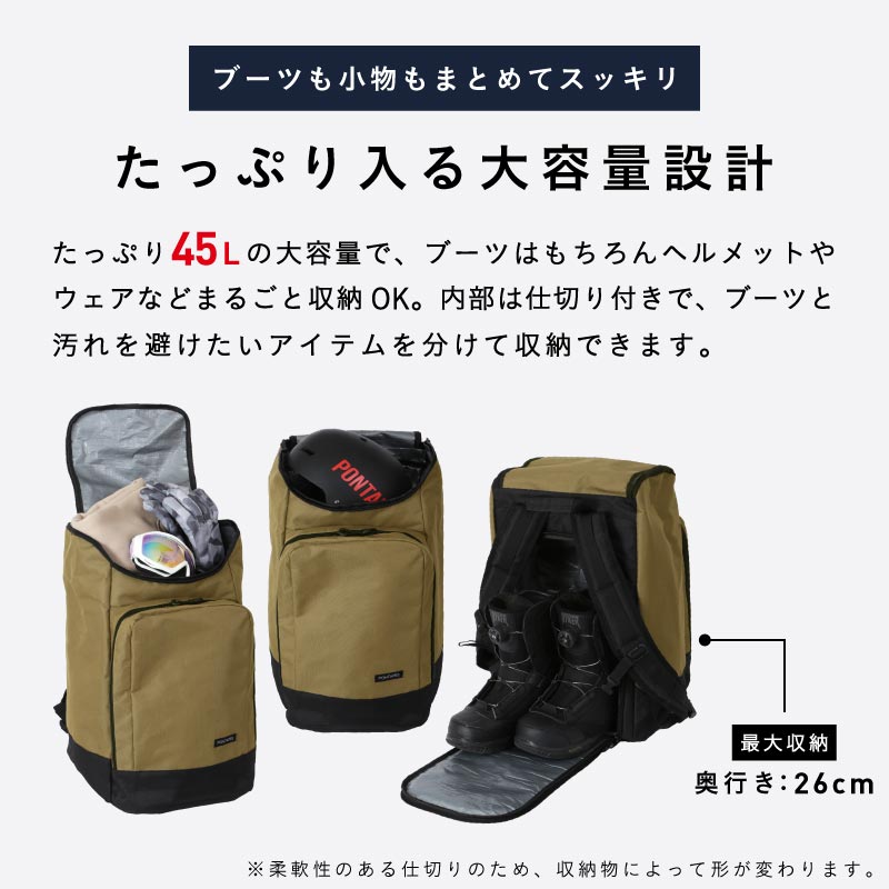 | PONTAPES PONBAG-140 유니섹스 부츠 백 부츠・웨어・소품 등을 수납할 수 있는 대용량 부츠 백! 헬멧이나 고글도 수납 가능합니다. 【부츠백】 ・안쪽은 내용물이 아프지 않는 쿠션 패드 ・신고 바꾸기용으로도 사용할 수 있는 매트 쿠션 사양 ・프런트 벨트는 높이 조절 가능 |