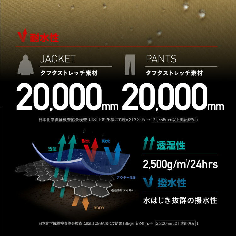 ・驚異の耐水・撥水力!高い耐水性能で雨雪などの水の侵入を防ぐ