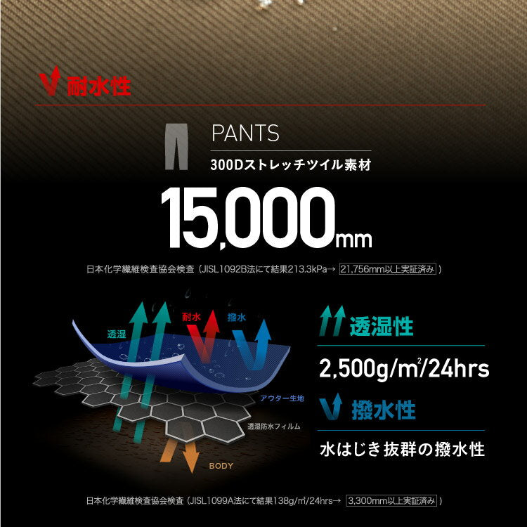 素材:耐水性・透湿性・撥水性に優れた透湿防水素材