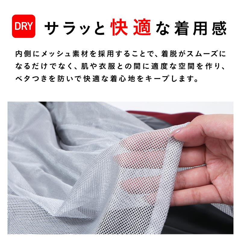 内側にメッシュ素材を貼り付けることで着脱が楽なのはもちろん、着用時の肌や衣服との隙間をつくりベタつきを防ぐ。