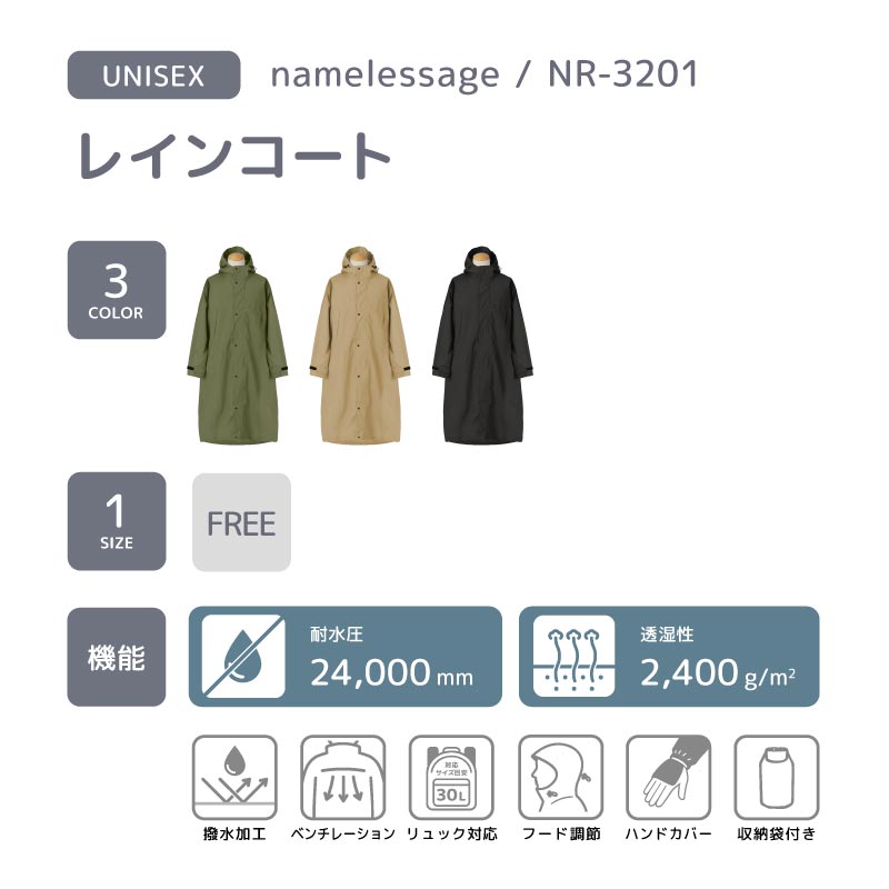 レインコート レディース メンズ レインウェア ロング丈 耐水圧24,000mm 蒸れにくい おしゃれ 動きやすい ママ NR-3201 namelessage/ネームレスエイジ ママアイテム