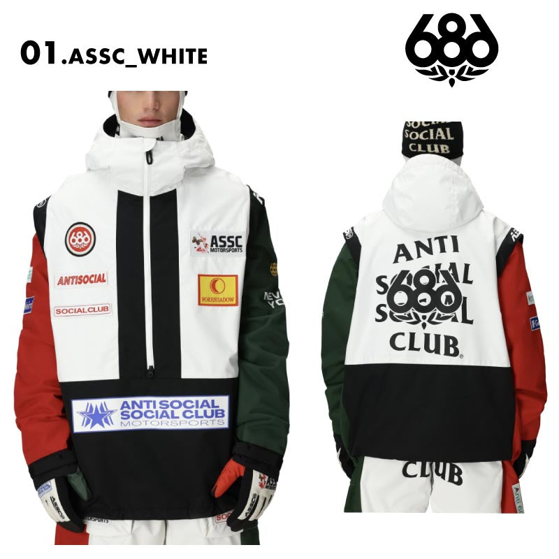 | 686/シックスエイトシックス メンズ スノージャケット MENS 686 ASSC F1 SHELL ANORAK 2025-26 WINTER M5WN175 「686」シックスエイトシックスのスノーボードウェアジャケットです。 ストリートファッションシーンで特に若い世代を中心に支持を集めているANTI SOCIAL SOCIAL CLUB(ASSC)とのコラボレーションモデル。 ASSCらしいデザインが目をひくアイテムです。 ◆素材:- |