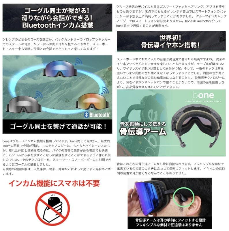 bone/ビーワン メンズ&レディース スノー ゴーグル bone-goggles 骨伝導イヤホンインカムヘルメット対応アジアンフィットトランシーバー男性用女性用